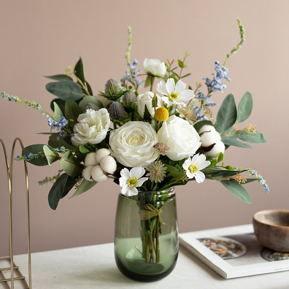 Faux flowers allow home decorators to defy the seasons, not only by having summer blooms in the dead of winter but by mixing flowers from several seasons in a single display. Some manufacturers use real materials to enhance silk flowers, such as inserting artificial branches in real tree trunks. Real touches are also added to the false flora; leaves may have holes that look like insect damage, silk roses are complete to the thorns, and some fabulous fakes are even fragrant. Their ultimate attraction may be their least natural aspects; these plants don’t need water, fertilizer, sunlight, or tender care.